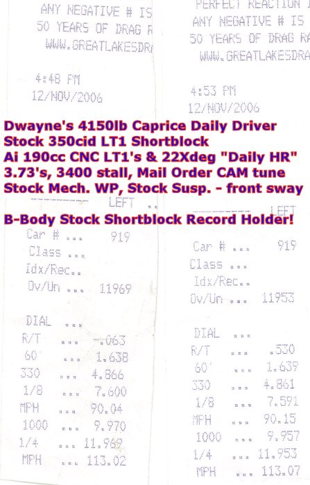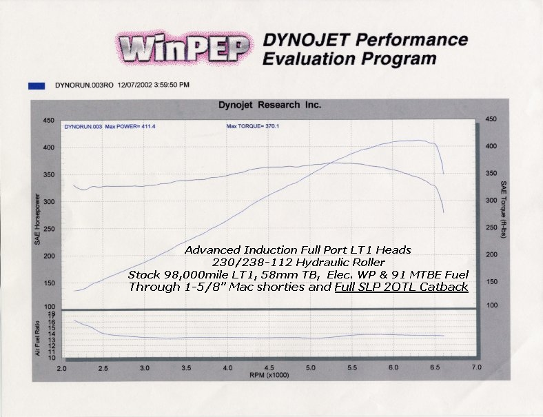stock LT1 shortblock with 98,000 miles, 91 octane MTBE fuel, and a